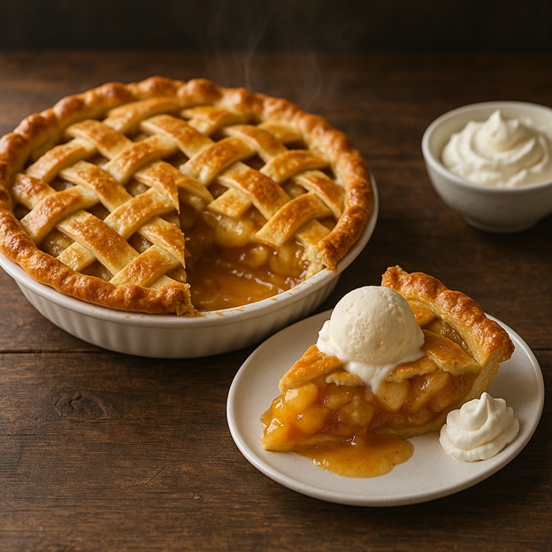 How to make: Preheat oven to 425°F. Mix sliced apples with sugar, flour, cinnamon, and nutmeg. Roll out bottom crust and place in 9-inch pie pan. Add apple mixture and dot with butter. Cover with top crust, seal edges, and cut vents. Brush with egg wash. Bake 45-50 minutes until golden brown.