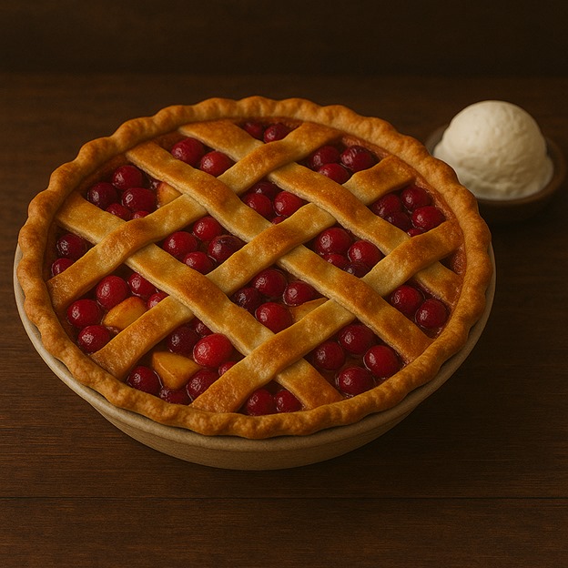 How to make: Preheat oven to 425°F. Combine apples, cranberries, sugar, cornstarch, and spices. Fill bottom crust with mixture and dot with butter. Cover with top crust, seal, and vent. Bake 45-50 minutes until golden and bubbly.